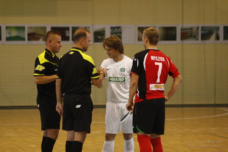 Rozpoczęło się obiecująco, w początkowych minutach biało-zieloni stwarzali kilka naprawdę wyśmienitych sytuacji do objęcia prowadzenia, by wspomnieć tylko okazję Radka Polaska czy strzał Michała Marka, po którym piłka odbiła się od słupka. Niejako zwieńczeniem tego fragmentu gry był gol zdobyty przez Piotra Szymurę, który dołożył nogę do zagrania M. Marka, a piłka wpadła do siatki mimo interwencji Zbigniewa Modrzika. Wyglądało nieźle, w końcu pojawił się również efekt bramkowy, więc powinno być już „z górki”. Nic bardziej mylnego – półtorej minuty po objęciu prowadzenia przez naszą drużynę mieliśmy ponownie remis – strzałem z kilku metrów nad rękoma Krystiana Brzenka popisał się Fabian Biernat. Prawdą jest, że taki rezultat nie był do końca sprawiedliwy, średnio na trzy sytuacje rekordzistów przypadała jedna tyszan, ale jak wiemy, liczy się to co „w sieci”. Tak więc z tzw. posiadania piłki, a było ono zdecydowanie po stronie zawodników Rekordu, niewiele wynikało.